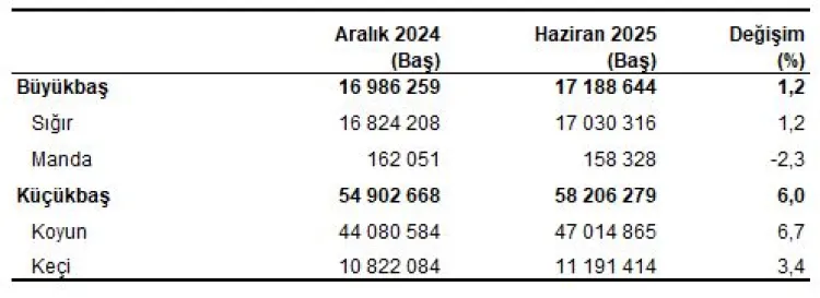 TÜİK'in Haziran ayı verilerine göre açıkladığı Hayvancılık İstatistikleri'nde büyükbaş hayvan sayısı, bir önceki yılın Aralık ayına göre yüzde 1,2 artarak 17 milyon 189 bin başa yükseldi. Küçükbaş hayvan sayısı ise yüzde 5,5 artışla 58 milyon 206 bin baş olarak kaydedildi. Büyükbaşta manda sayısı yüzde 2,3 oranında azaldı.