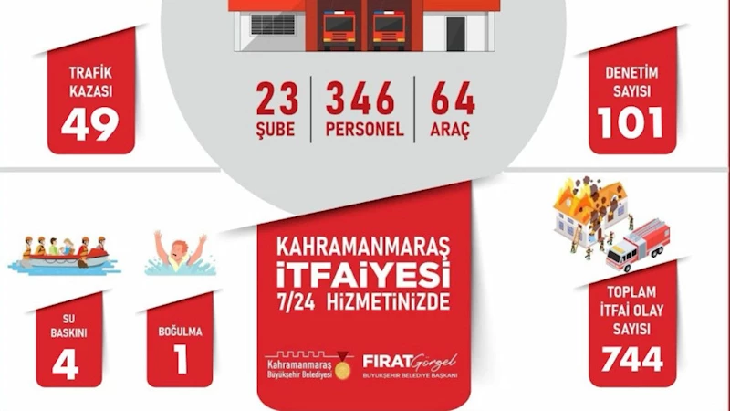 Kahramanmaraş Büyükşehir Belediyesi İtfaiye Dairesi Başkanlığı, modern araç ve ekipmanları ile donatılmış filosu ve alanında uzman personeliyle 7 gün 24 saat vatandaşların can ve mal güvenliği için görev başında. Mayıs ayı boyunca şehir genelinde gerçekleştirilen faaliyetler, itfaiyenin yoğun ve etkin çalışmalarını bir kez daha gözler önüne serdi. 23 şube, 64 araç ve 346 personelle yürütülen hizmetlerde Mayıs ayı içerisinde toplam bin 109 olaya müdahale edildi. Bu olaylar arasında 311 yangın, 49 trafik kazası, 4 su baskını, 1 boğulma vakası ve 744 çeşitli itfai olay yer aldı.