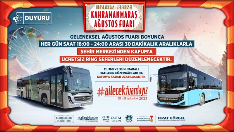 Kahramanmaraş Büyükşehir Belediyesi, 1 – 31 Ağustos tarihleri arasında KAFUM’da düzenlenecek Uluslararası Geleneksel Ağustos Fuarı’na vatandaşların kolay ve konforlu bir şekilde ulaşabilmesi için ulaşım desteğini artırdı. Fuar boyunca her gün ücretsiz ring seferleri ile ziyaretçilerin ulaşımı sağlanacak.