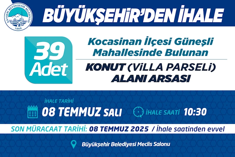 Kocasinan İlçesi Güneşli Mahallesi’nde bulunan 39 adet konut (villa parseli) alanı arsanın ihalesi 08 Temmuz 2025 Salı günü saat 10.30’da gerçekleştirilecek.
