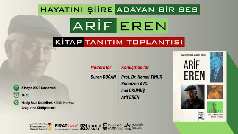 Kitabın tanıtım toplantısı, 3 Mayıs Cumartesi günü Necip Fazıl Kısakürek Kültür Merkezi’nde gerçekleştirilecek. Saat 14.30’da başlayacak programda; Büyükşehir Belediyesi Kültür, Gençlik ve Spor Dairesi Başkanı Duran Doğan, KSÜ Yeni Türk Edebiyatı Ana Bilim Dalı Başkanı ve kitabın yazarlarından Prof. Dr. Kemal Timur, kitabın öznesi Arif Eren ile edebiyat camiasının tanınmış isimlerinden Ramazan Avcı ve İnci Okumuş konuşma yapacak. Katılımcılar, Arif Eren’in şiire adanmış hayatını ve edebi birikimini yakından tanıma fırsatı bulacak. Şiirle yoğrulmuş bir hayatın izlerini taşıyan bu özel eser vesilesiyle düzenlenecek etkinlikte, Arif Eren’in şiir anlayışı, eserlerine yansıttığı duygular ve edebi kimliği üzerine de değerli paylaşımlar yapılacak. Büyükşehir Belediyesi, tüm okurları ve edebiyatseverleri bu anlamlı programa davet ediyor.