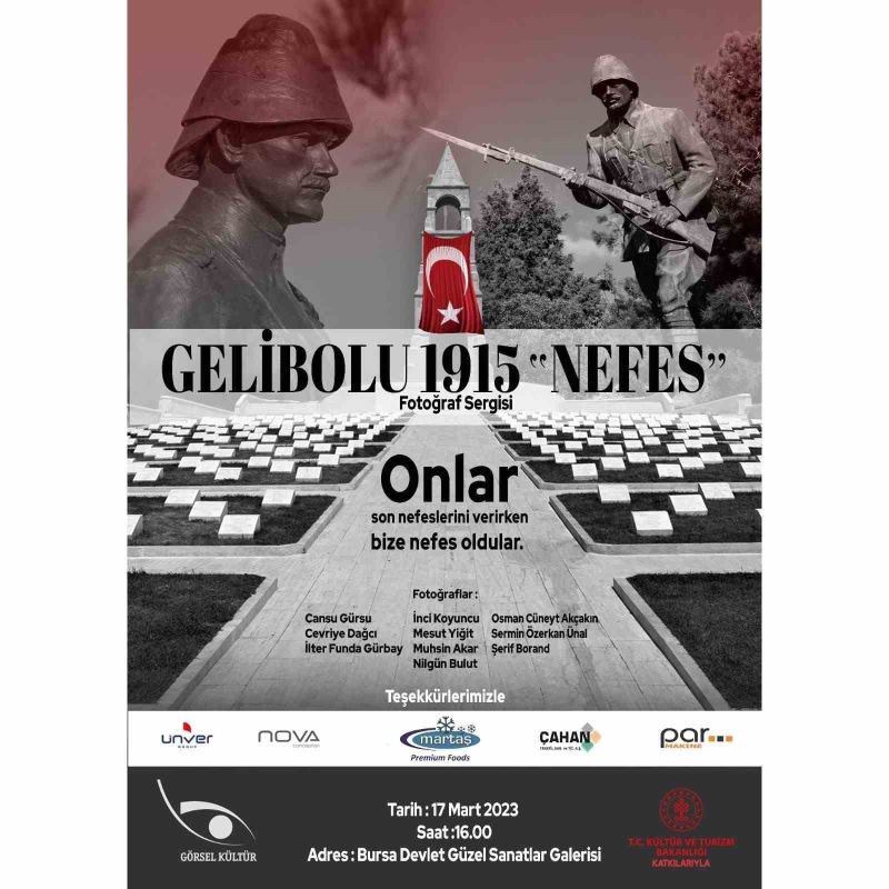 Cumhuriyetin 100. yılını borçlu olduğumuz Çanakkale ve Gelibolu şehitlerini anmak ve onların üzerlerimizdeki haklarını gelecek kuşaklara aktarılmasını sağlayacak farkındalığı oluşturmak isteyen Bursa Görsel Kültür Derneği, ’Nefes’ isimli fotoğraf sergisini açıyor. 17 Mart Cuma günü saat 16.00’da açılacak sergi, 26 Mart Cumartesi gününe kadar Bursa Devlet Güzel Sanatlar Galerisi’nde ziyaret edilebilecek. Dernek üyesi 10 fotoğrafçının 8 günlük Gelibolu’da çalışması sonucu, 90 fotoğraflık sergide iki video sunumu da yapılacak. Öte yandan Çanakkale Savaşları Alan Başkanlığı’nın desteği ile Gelibolu ve Çanakkale Savaşlarında kullanılan tarihi objeler de özel korumayla Bursa’ya getirilerek sergi alanında ziyaretçilere sunulacak.