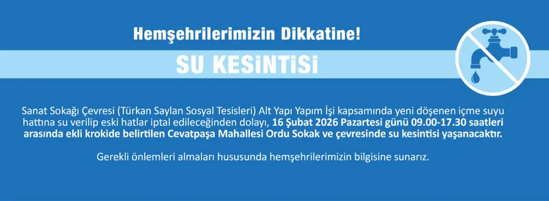 Su kesintisi, 16 Şubat 2026 Pazartesi günü, saat 09.00 ile 17.30 arasında uygulanacak. Kesintiden etkilenecek alan, Cevatpaşa Mahallesi Ordu Sokak ve çevresi olarak belirlendi.