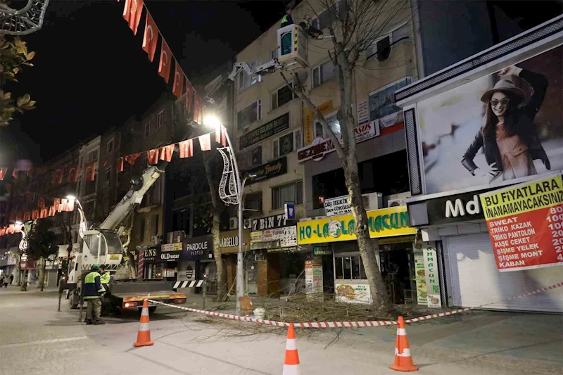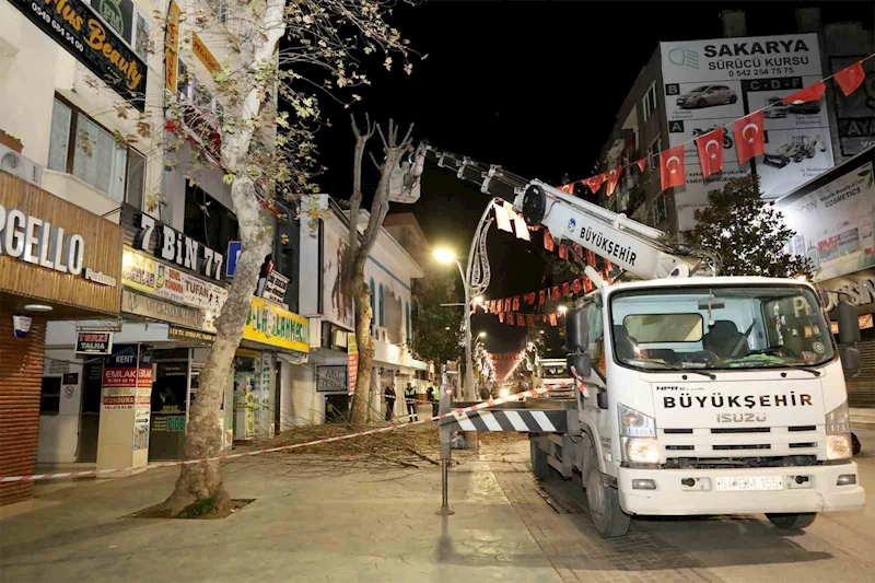Sakarya Büyükşehir Belediyesi, vatandaşın güvenliğini sağlamak ve estetik görünüme katkı sunmak için Çark Caddesi’ndeki ağaçları budayarak düzenli bir görüntü için mesai harcıyor.