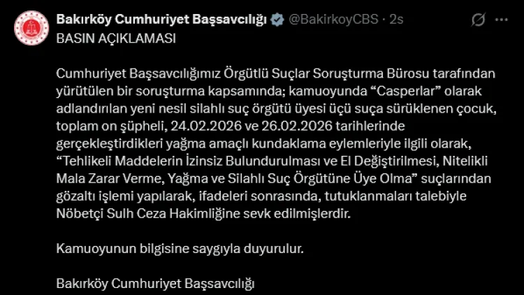 Bakırköy Cumhuriyet Başsavcılığı, kamuoyunda “Casperlar” olarak bilinen silahlı suç örgütüne yönelik soruşturma kapsamında 3’ü suça sürüklenen çocuk olmak üzere 10 şüphelinin gözaltına alındığını açıkladı.