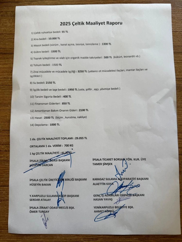İpsala Ziraat Odası, İpsala Ticaret Borsası, sulama kooperatifleri ve diğer paydaşların katkısıyla hazırlanan raporda maliyet kalemleri şöyle sıralandı: