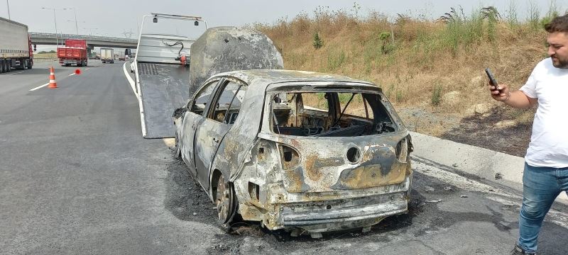 Aracın bir anda alev aldığını söyleyen sürücü Sinan Karabacak, ”Araç bir anda alev alınca aracı sağ çektik. Yangın söndürme tüpleri ile söndürmeye çalıştık. Sağ olsun arkadaşlar yardım etti, itfaiye geldi. Bütün aile araçtaydı. Şükür canımıza bir şey olmadı. Araç kül oldu ama önemi yok. Sağlımız yerinde şükür” diye konuştu.