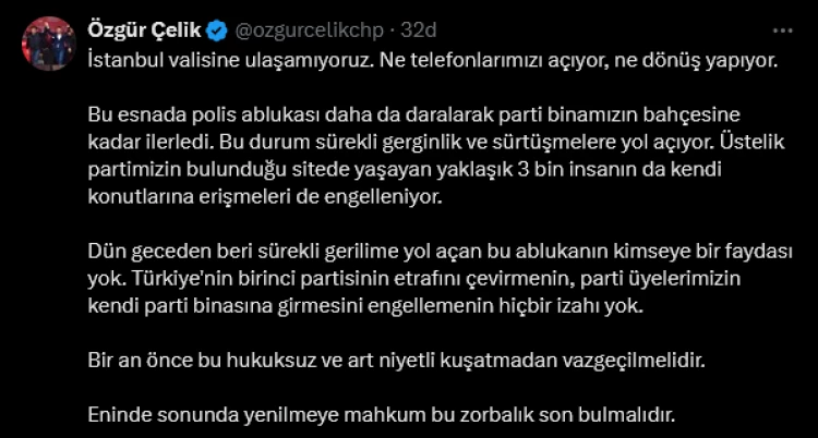 Özgür Çelik, paylaşımında, “Bu durum sürekli gerginlik ve sürtüşmelere yol açıyor. Partimizin bulunduğu sitede yaşayan yaklaşık 3 bin insanın da kendi konutlarına erişmeleri engelleniyor. Dün geceden beri sürekli gerilime yol açan bu ablukanın kimseye faydası yok. Türkiye’nin birinci partisinin etrafını çevirmenin, parti üyelerimizin kendi parti binasına girmesini engellemenin hiçbir izahı yok” ifadelerini kullandı.