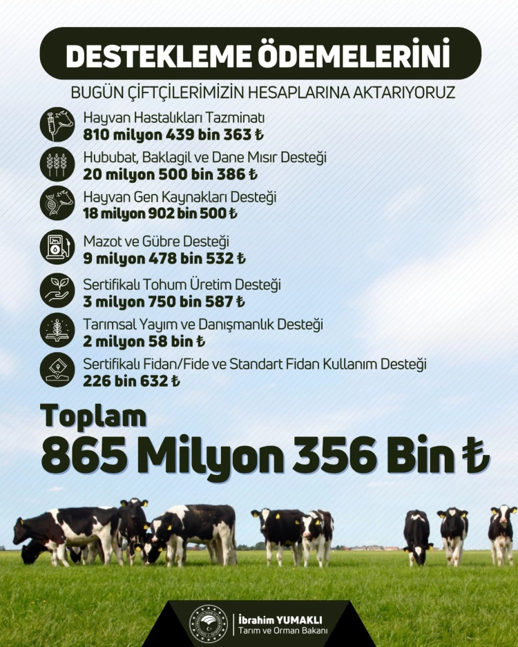 Tarım ve Orman Bakanı İbrahim Yumaklı, 865 milyon 356 bin TL’lik tarımsal destekleme ödemesinin bugün çiftçilerin hesaplarına aktarıldığını açıkladı.