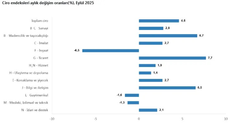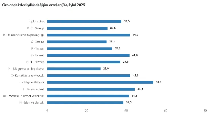 TÜİK verilerine göre sanayi, inşaat, ticaret ve hizmet sektörlerinin toplam ciro endeksi 2025 yılı Eylül ayında bir önceki yılın aynı ayına göre yüzde 37,5 arttı. Aylık bazda ise toplam ciro yüzde 4,6 yükseldi.