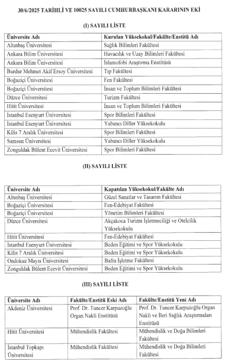 Üç üniversitede ise birim isimleri güncellendi. Akdeniz Üniversitesi’nde Prof. Dr. Tuncay Karpuzoğlu Organ Nakli Enstitüsü, “Prof. Dr. Tuncer Karpuzoğlu Organ Nakli ve İleri Sağlık Araştırmaları Enstitüsü” olarak yeniden adlandırıldı.