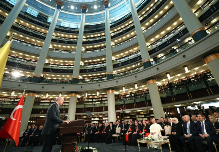 ANKARA (İGFA) - Cumhurbaşkanı Recep Tayyip Erdoğan, baş başa ve heyetler arası görüşmelerin ardından Vatikan Devlet Başkanı Papa 14. Leo ile Cumhurbaşkanlığı Millet Kütüphanesi’ndeki Cihannüma Salonu’nda düzenlenen programda konuştu.