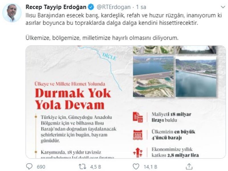 Cumhurbaşkanı Recep Tayyip Erdoğan, sosyal medya hesabından Ilısu Barajı’yla ilgili paylaşımda bulundu.