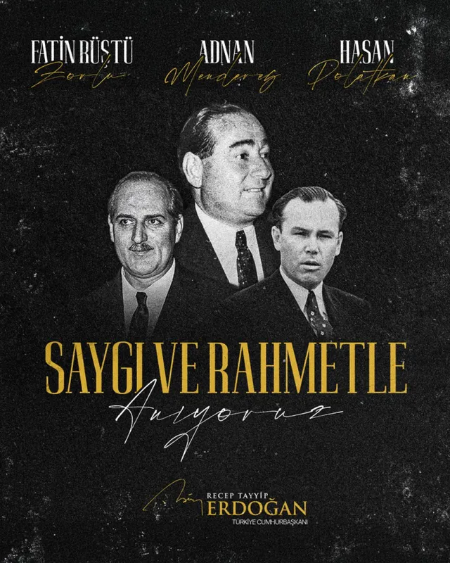 Cumhurbaşkanı Recep Tayyip Erdoğan, 27 Mayıs 1960 darbesinde idam edilen eski Başbakan Adnan Menderes, Dışişleri Bakanı Fatin Rüştü Zorlu ve Maliye Bakanı Hasan Polatkan’ın katledilişlerinin 64. yılında bir anma mesajı yayımladı.