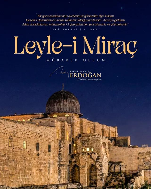 Cumhurbaşkanı Recep Tayyip Erdoğan, Miraç Gecesi dolayısıyla bir mesaj yayımlayarak, tüm İslam âleminin kandilini tebrik etti.