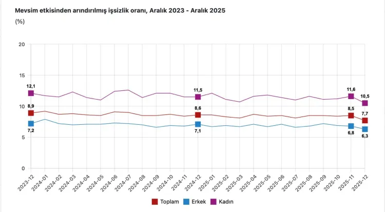 Mevsim etkisinden arındırılmış verilere göre Aralık ayında işsizlik oranının yüzde 7,7’ye gerilediğini belirten Yılmaz, bu oranın aylık işgücü istatistiklerinin açıklanmaya başlandığı 2005 yılından bu yana en düşük seviye olduğunu vurguladı. İşsizliğin 32 aydır tek haneli seviyelerde seyrini sürdürdüğünü aktaran Yılmaz, gençlerde işsizliğin geçen yılın aynı ayına göre 1,9 puan azalarak yüzde 14,1’e, kadınlarda ise 1 puan düşüşle yüzde 10,5’e gerilediğini kaydetti.