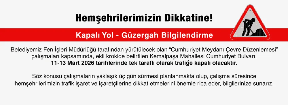 Çanakkale Belediyesi Fen İşleri Müdürlüğü, "Cumhuriyet Meydanı Çevre Düzenlemesi" projesi kapsamında çalışmalara başlayacak. Bu kapsamda, Kemalpaşa Mahallesi'ndeki Cumhuriyet Bulvarı'nın belirli bir bölümü trafiğe kapatılacak.