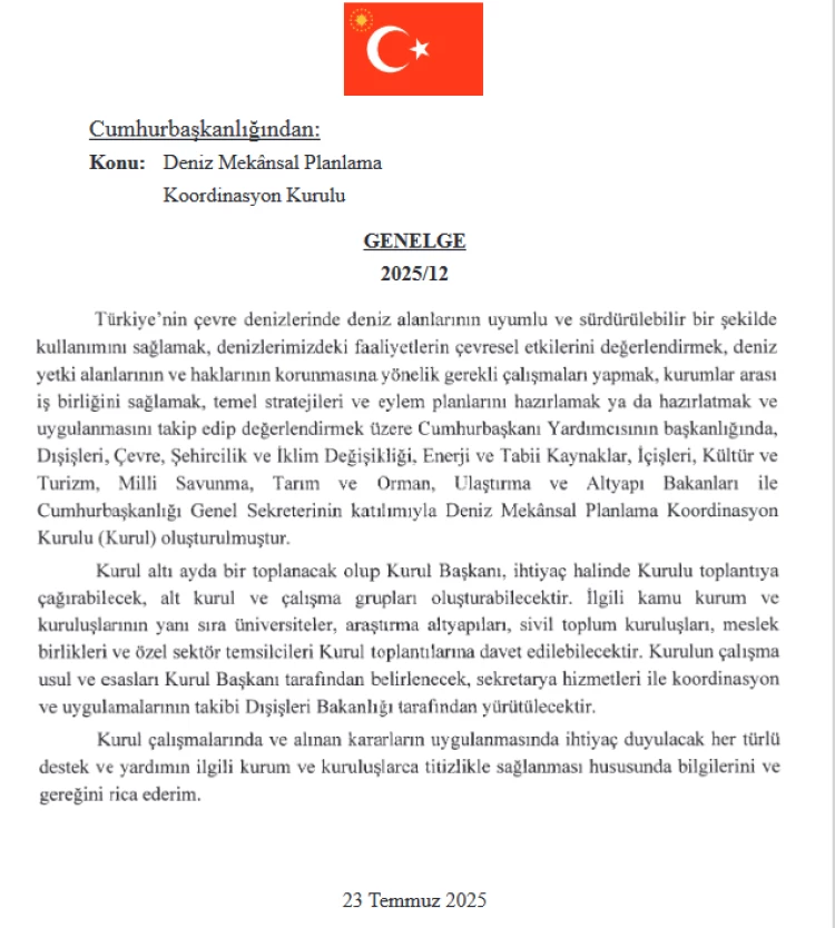 ANKARA (İGFA) - Bugünkü Resmi Gazete’de yayımlanan 2025/12 Sayılı Cumhurbaşkanlığı Genelgesi ile Deniz Mekânsal Planlama Koordinasyon Kurulu’nun kurulduğu duyuruldu.