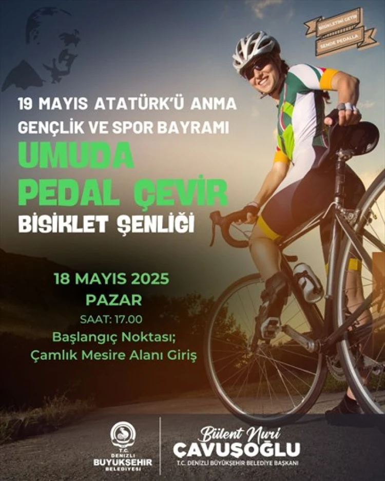 18 Mayıs Pazar günü saat 17.00’de Çamlık Mesire Alanı girişinde düzenlenecek olan “Umuda Pedal Çevir Bisiklet Şenliği”, yurdun dört bir yanından bisiklet tutkunlarını bir araya getirecek. Denizlili vatandaşların büyük ilgi göstermesi beklenen etkinliğe, İzmir, Muğla, Manisa, Uşak, Ankara ve İstanbul’dan bisiklet grupları da katılacak.