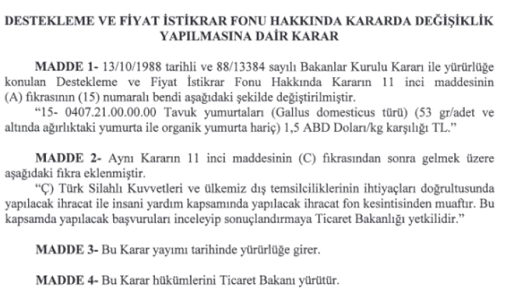Buna göre 13 Ekim 1988'den bu yana yürürlükte olan Destekleme ve Fiyat İstikrarı Fonu Hakkında Kararın 11. maddesinin A fıkrasının 15 numaralı bendi; "Tavuk yumurtaları (Gallus domesticus türü) (53 gr/adet ve altında ağırlıktaki yumurta ile organik yumurta hariç) 1,5 ABD Doları/kg karşılığı TL" olarak değiştirildi.