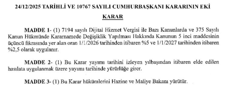 Söz konusu karara göre 1 Ocak 2026 tarihinden itibaren Dijital Hizmet Vergisi oranı yüzde 5 olarak uygulanacak. 1 Ocak 2027 tarihinden itibaren ise bu oran yüzde 2,5 seviyesine indirilecek.