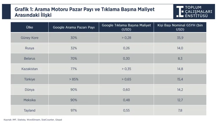 Türkiye’de Google’ın arama pazar payının yüzde 85’in üzerinde olduğu, TBM’nin ise 0,65 dolar ile tabloda yer alan ülkeler arasında en yüksek seviyelerden birine ulaştığı ifade edildi. Dünya ortalaması ise 0,60 dolar.