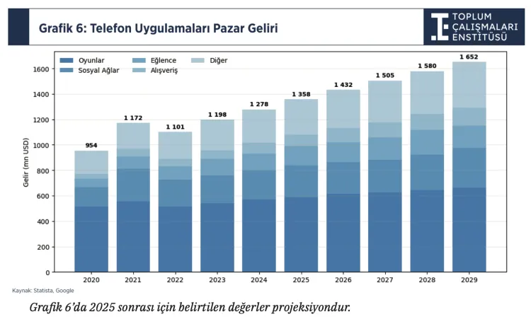 Mobil uygulama gelirlerinin 2020’de 954 milyon dolardan 2024’te 1,278 milyar dolara çıktığı, 2029’da 1,652 milyar dolara ulaşmasının beklendiği aktarıldı. Gelirlerin en büyük kısmını oyun uygulamaları oluşturuyor. Uygulama mağazası gelir dağılımında ise Google Play’in yüzde 61, App Store’un yüzde 39 paya sahip olduğu belirtildi. Rapora göre geliştiriciler fiilen bu iki mağazaya bağımlı.