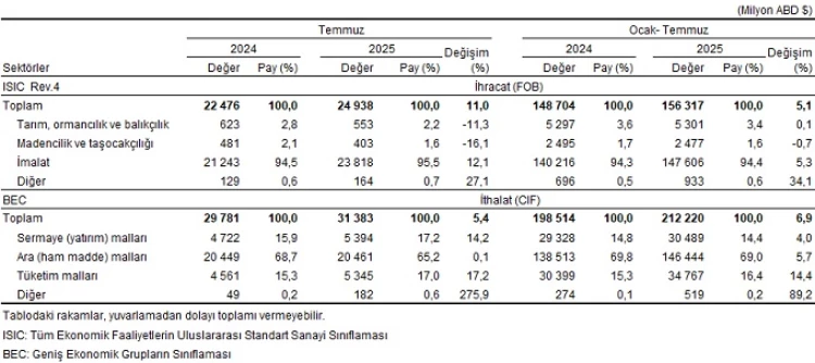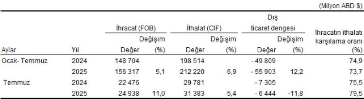 2025 yılının Ocak-Temmuz döneminde ihracat yüzde 5,1 artarak 156 milyar 317 milyon dolar, ithalat yüzde 6,9 artarak 212 milyar 220 milyon dolar oldu.