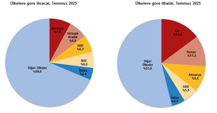 Türkiye İstatistik Kurumu (TÜİK) ve Ticaret Bakanlığı’nın verilerine göre, Temmuz 2025’te ihracat yüzde 11 artarak 24,9 milyar dolar, ithalat yüzde 5,4 artarak 31,4 milyar dolar oldu. Dış ticaret açığı yüzde 11,8 azalarak 6,4 milyar dolara geriledi.