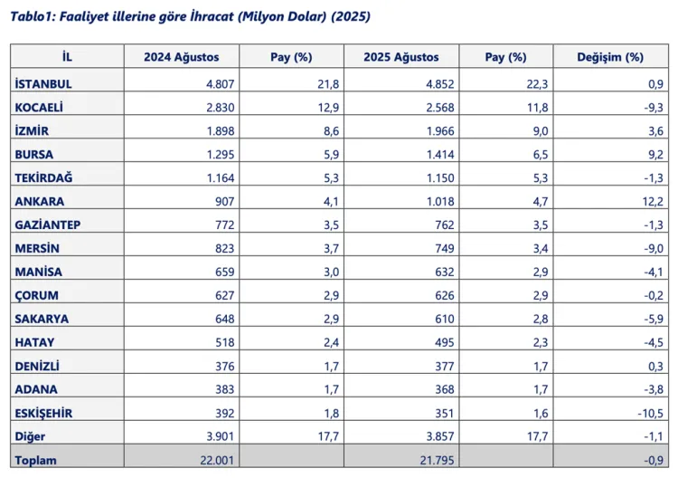 İstanbul'un 4,85 milyar dolarlık ihracatla başı çektiği Ağustos ayında ihracatta ilk 5 'te Kocaeli (2,57 milyar dolar), İzmir (1,97 milyar dolar), Bursa (1,41 milyar dolar) ve Tekirdağ (1,15 milyar dolar) yer aldı. İkinci 5'te ise Ankara, Gaziantep, Mersin, Manisa ve Çorum illeri takip etti.