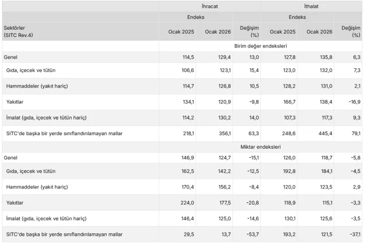 Mevsim ve takvim etkilerinden arındırılmış serilere göre ihracat miktar endeksi Aralık 2025’te 146,4 iken Ocak 2026’da yüzde 5,0 azalarak 139,1’e geriledi. İthalat miktar endeksi ise aynı dönemde yüzde 3,0 düşüşle 126,7’ye indi.