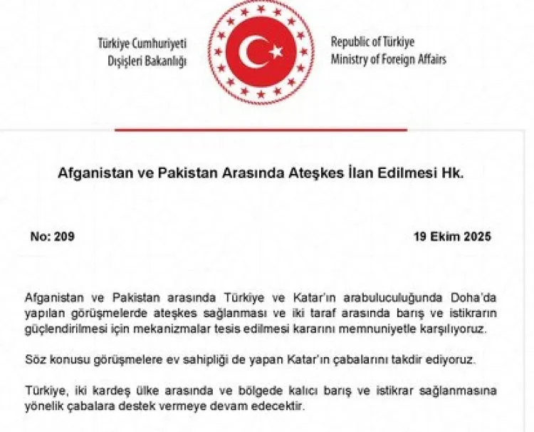 Dışişleri Bakanlığı, Afganistan ve Pakistan'ın Doha'da Türkiye ve Katar arabuluculuğundaki görüşmelerde ateşkesi ve barış mekanizmalarını memnuniyetle karşıladı. Bakanlık, Katar'ın çabalarını takdir ettiğini açıklayarak desteğini sürdüreceğini belirtti.