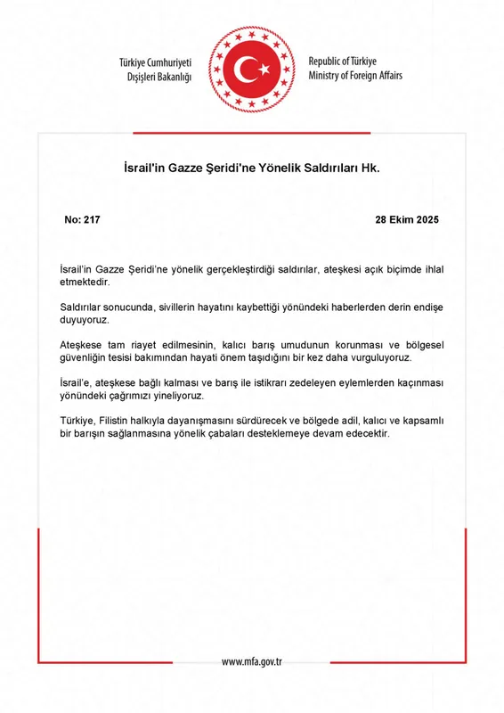 Türkiye, Gazze Şeridi’ne yönelik saldırıların ateşkesi ihlal ettiğini belirterek İsrail’e “barış ve istikrarı zedeleyen eylemlerden kaçının” çağrısında bulundu.