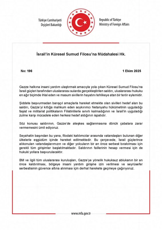 Dışişleri Bakanlığı, Gazze’ye yardım taşıyan Küresel Sumud Filosu’na uluslararası sularda İsrail güçlerinin saldırısını kınadı. “Barışçıl sivilleri hedef alan bu faşist terör eylemi, Netanyahu’nun soykırım politikalarının kanıtı” denildi. Bakanlık, alıkonulan vatandaşların serbest bırakılması için girişim başlattı ve BM’yi ablukanın kaldırılmasına çağırdı.