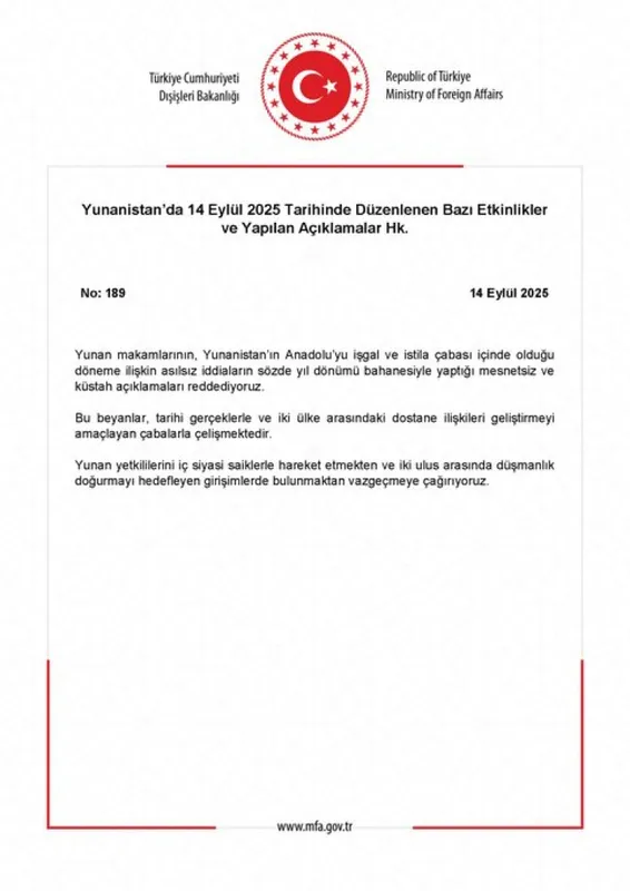 Dışişleri Bakanlığı, Yunanistan’ın Anadolu’nun işgali ve istilası dönemine ilişkin asılsız iddialarla ilgili sözde yıl dönümü etkinlikleri ve açıklamalarını kınadı. Bakanlık, bu beyanların tarihi gerçeklerle çeliştiğini ve iki ülke arasındaki dostane ilişkileri baltaladığını öne sürdü.