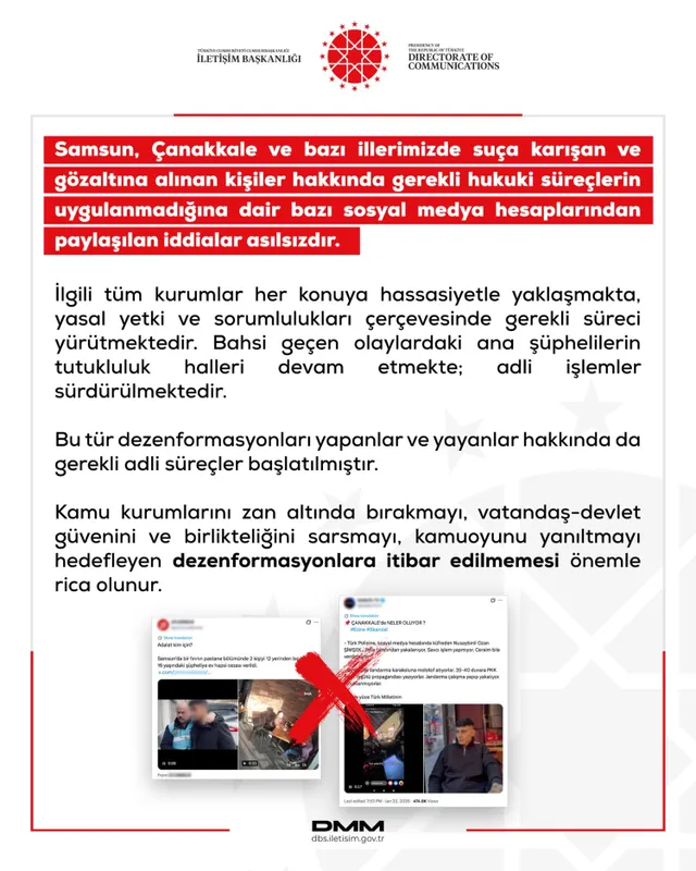 ANKARA (İGFA) - İletişim Başkanlığı Dezenformasyonla Mücadele Merkezi, bazı sosyal medya hesaplarında Samsun, Çanakkale ve diğer illerde gözaltına alınan kişilere yönelik hukuki işlemlerin yapılmadığı yönündeki iddiaların asılsız olduğunu duyurdu.