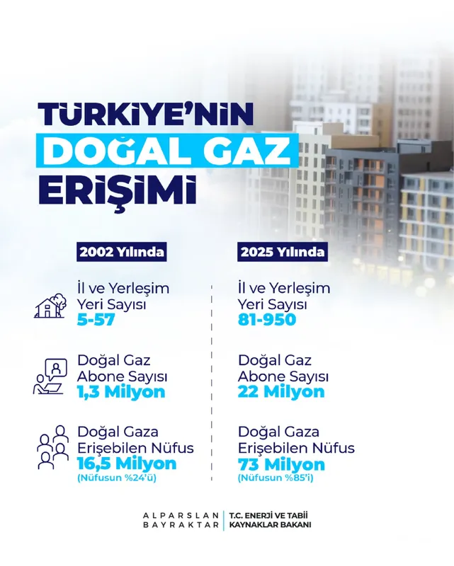 2002 yılında sadece 5 il ve 57 yerleşim yerinde olan doğal gazı, bugün 81 ilin tamamına, 950 yerleşim yerine ve 22 milyon aboneye ulaştırdıklarını vurgulayan Bakan Bayraktar, son bir yılda 51 yerleşim yerine gaz arzı sağlandığını ve konut abonesi sayısının yaklaşık 1 milyon arttığını belirtti.