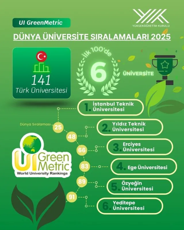 Dünya genelinde 105 ülkeden 1745 üniversitenin değerlendirildiği UI GreenMetric 2025 sıralamasında Türkiye’den 141 üniversite yer aldı, 6’sı ilk 100 içine girmeyi başardı. YÖK Başkanı Erol Özvar, söz konusu sonuçların, üniversitelerin yeşil dönüşümdeki kararlılığını gösterdiğini söyledi.