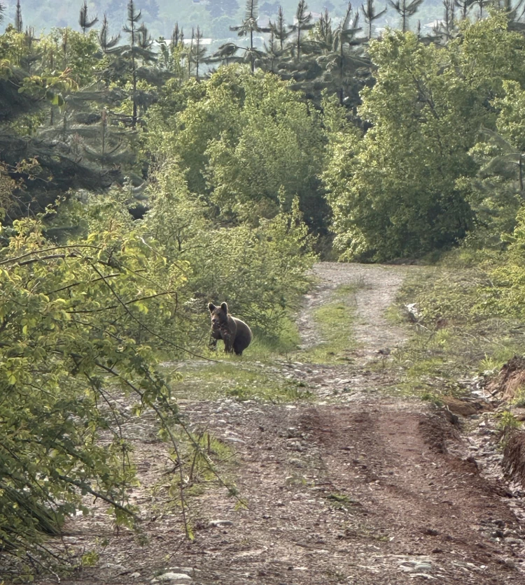Kısa süre sonra ağaçların arasından çıkan, yaklaşık 2-3 aylık olduğu tahmin edilen yavru bir ayı, piknik alanına doğru ilerledi.