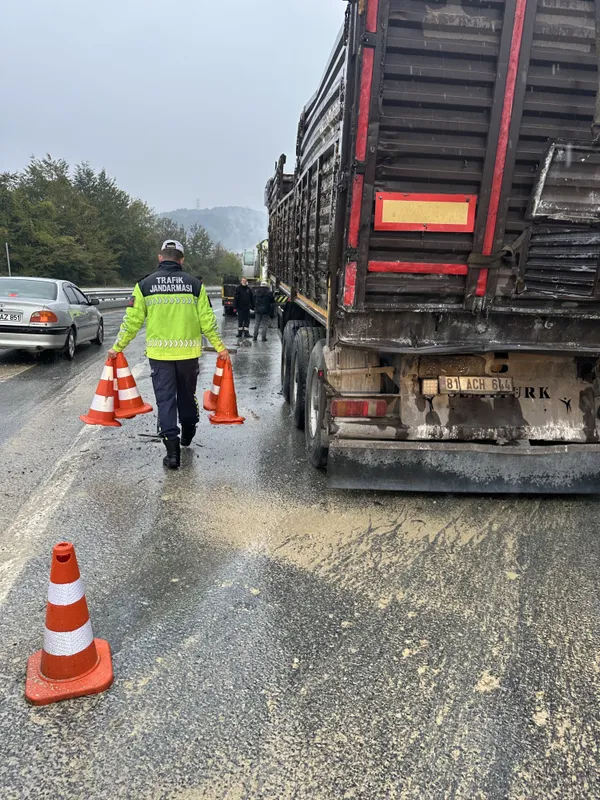 D-655 Düzce-Zonguldak bağlantı yolunun Şifalı Su mevkisinde meydana gelen kazada, 81 ACH 644 plakalı tır sürücüsünün direksiyon hâkimiyetini kaybetmesi sonucu bariyerlere çarptı.