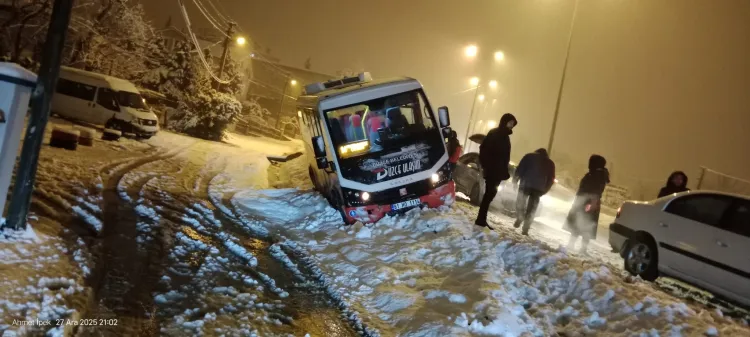 Düzce’de kontrolden çıkan halk otobüsünün şarampole devrildiği kazada facia ucuz atlatıldı. Kazada yaralanan olmazken, otobüste kış lastiği bulunmadığının tespit edilmesi tepki çekti.