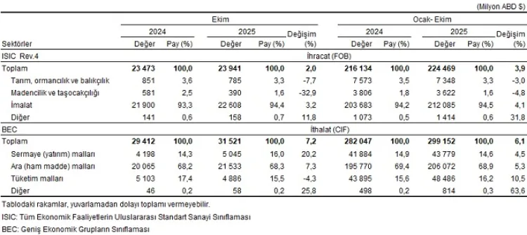 Ocak–Ekim döneminde ihracat yüzde 3,9 artarak 224,5 milyar dolar, ithalat ise yüzde 6,1 artarak 299,1 milyar dolar olarak gerçekleşti. Bu dönemde dış ticaret açığı yüzde 13,3 artışla 74,7 milyar dolara yükseldi.