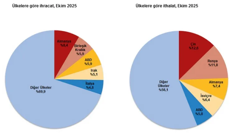 TÜİK’in dış ticaret verilerine göre Ekim 2025’te ihracat yıllık bazda yüzde 2 artarken ithalat yüzde 7,2 yükseldi. Dış ticaret açığı 7,6 milyar dolara çıktı. Ekim ayında en fazla ihracat 2 milyar 3 milyon dolarla Almanya’ya yapılırken, ithalatta ilk sırayı 3,9 milyar dolarla Çin aldı.