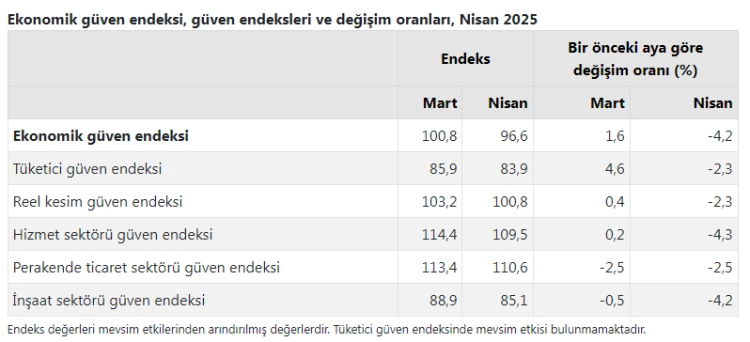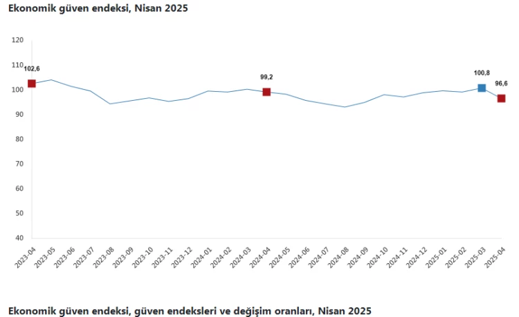Türkiye İstatistik Kurumu (TÜİK) tarafından açıklanan istatistiklere göre ekonomik güven endeksi Mart ayında 100,8 iken, Nisan ayında yüzde 4,2 oranında azalarak 96,6 değerini aldı.