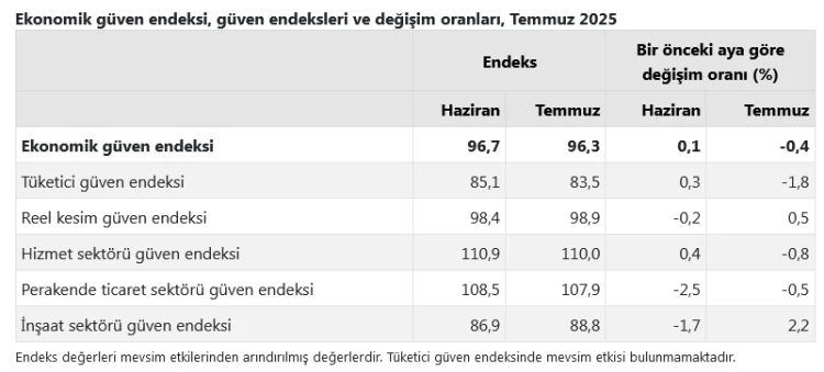 Türkiye’de ekonomik güven endeksi, Haziran ayındaki 96,7’den Temmuz’da yüzde 0,4 azalarak 96,3’e düştü. Sektörel güven endekslerinde ise karışık bir tablo ortaya çıktı.