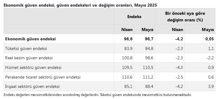 TÜİK verilerine göre, ekonomik güven endeksi Mayıs’ta yüzde 0,05 artarak 96,7 oldu. Tüketici, hizmet, perakende ve inşaat sektörlerinde güven artarken, reel kesimde (imalat sanayi) düşüş gözlendi.