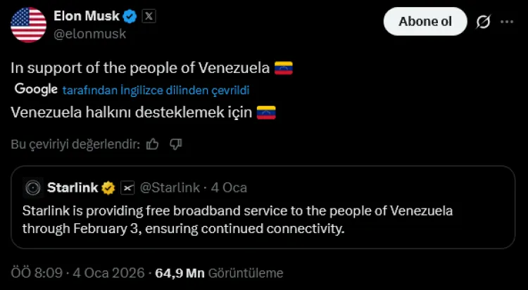Elon Musk, Venezuela’da yaşanan gelişmeler sonrası ABD’nin operasyonuna destek verdiğini açıklayarak, ülkede bir ay boyunca Starlink üzerinden ücretsiz internet hizmeti sunulacağını duyurdu.