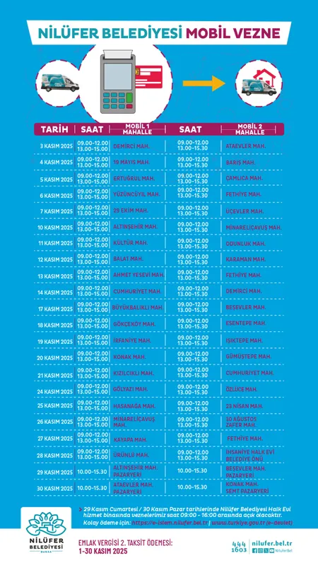 Bursa'da Nilüfer Belediyesi, 2025 yılı Emlak Vergisi 2’nci taksit dönemi için tüm hazırlıklarını tamamladı. Vatandaşların ödemelerini kolaylıkla yapabilmeleri amacıyla 1-30 Kasım tarihleri arasında sabit veznelerden mobil veznelere, online sistemlerden banka kanallarına kadar pek çok alternatif sunuluyor.