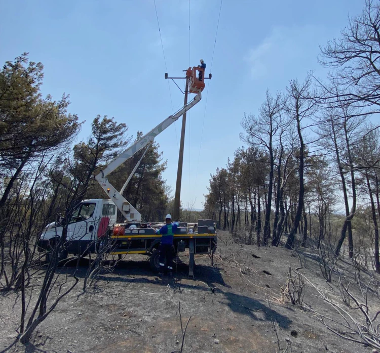 BURSA (İGFA) - Türkiye, peş peşe çıkan orman yangınlarına karşı yoğun bir mücadele yürütüyor. UEDAŞ, enerji altyapısının güvenliğini sağlamak amacıyla sahada çeşitli müdahaleler gerçekleştiriyor. Şirket faaliyet gösterdiği Çanakkale’de yangından etkilenen bölgelerde, şebekenin kontrol ve onarım çalışmalarına başladı. Aynı zamanda yangında görevli ekiplerin toplanma alanlarına da sepetli araçlarla projektör ve jeneratör desteği sağlanıyor.