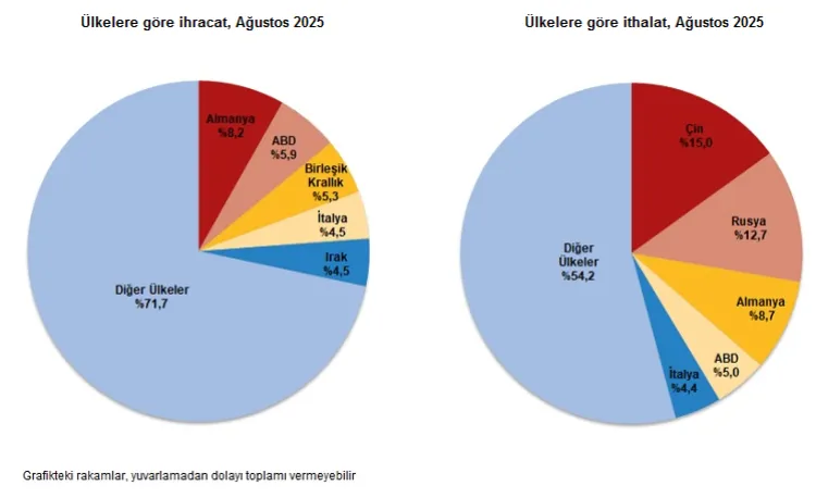 Ağustos’ta en fazla ihracat Almanya’ya (1,8 milyar dolar), en fazla ithalat Çin’den (3,9 milyar dolar). İlk 5 ülkeye ihracat toplamın yüzde 28,3’ünü, ithalat yüzde 45,8’ini oluşturdu.